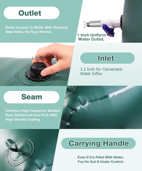 3, Water bag with sleeved water pipe direct port, can be connected to water pipe, very convenient to use; as a non-potable water storage and recycling rainwater collector, suitable for outdoor, home, garden, camping, RV, drought resistance, firefighting agricultural use, emergency water supply and other places without fixed water storage facilities.
