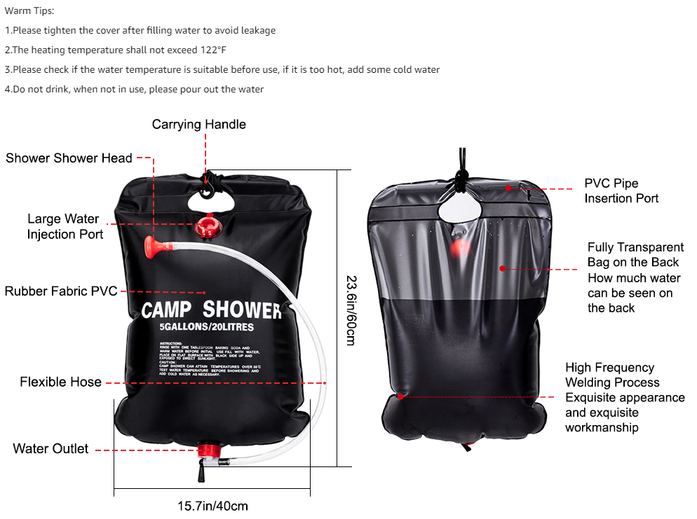 2, Mobile shower can contain large 5-Gallon/20 Liters water capacity enough water for multiple showers of water to keep you clean.