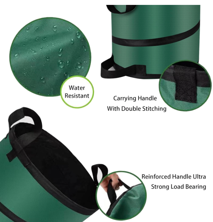 4, The pop-up and foldable design allows you to complete the work easier and faster, the pop up garbage can is reinforced with two double-stitched nylon handles, and the bottom handles are easy to dump and empty garbage can.